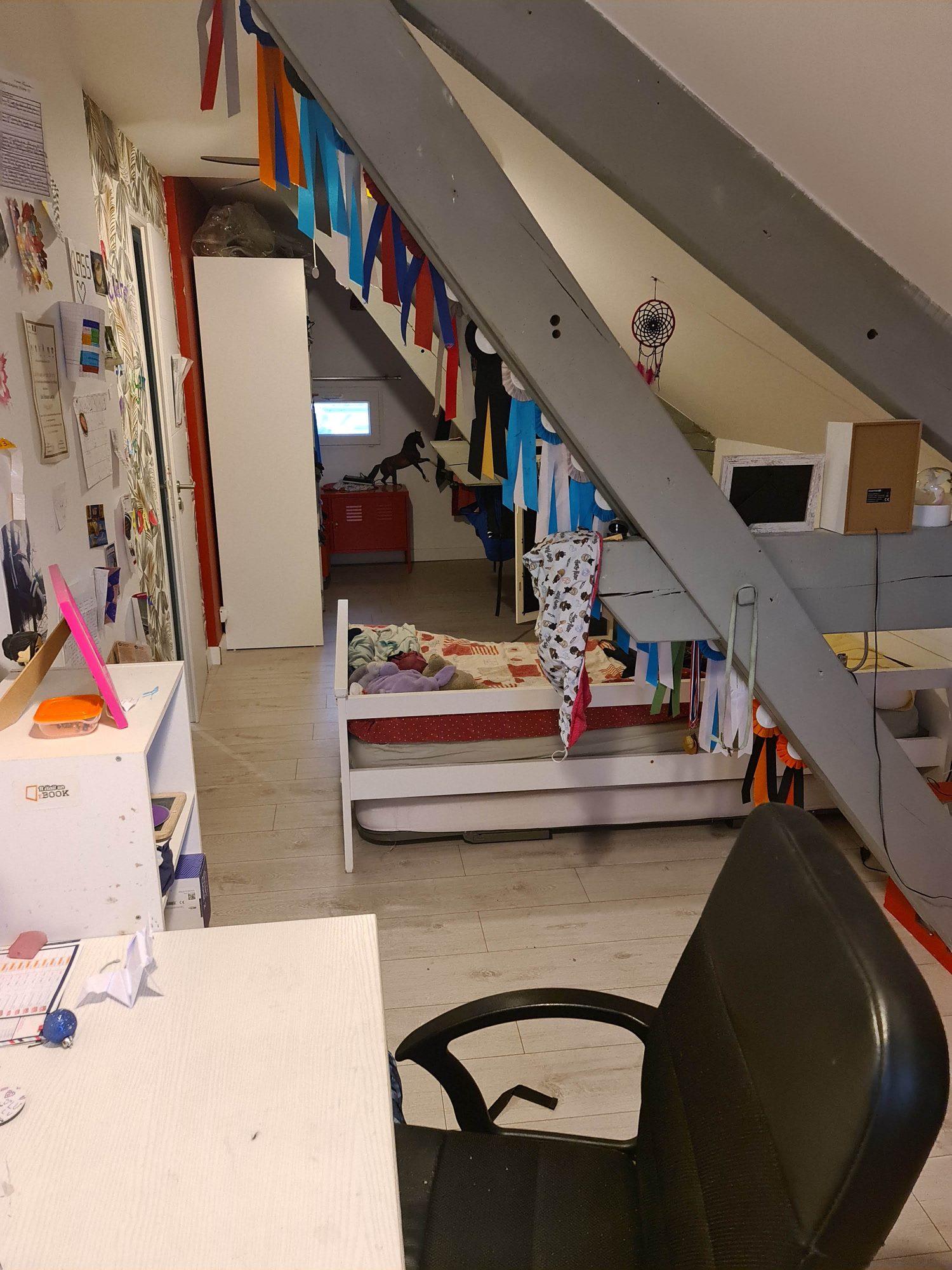A l'étage, un Palier donnant sur 2 CHAMBRES, un Bureau, une Salle Bains et un WC,